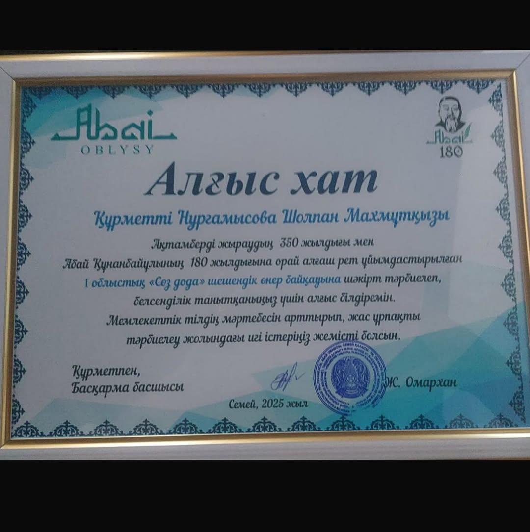 Уржар ауданында өткен Ақтамберді жыраудың 350 жылдығы мен Абай Құнанбайұлының 180 жылдығына орай алғаш рет ұйымдастырылған І облыстық “Сөз дода”шешендік өнер байқауына қатысып, арнайы сертификатпен марапатталған 8”В”сынып оқушысы Әнуарұлы Әмір мен жетекшісі Нургамысова Шолпан Махмұтқызын құттықтаймыз!